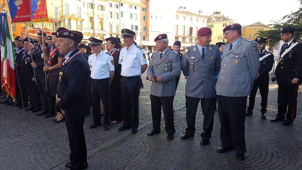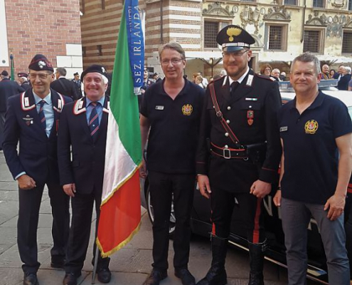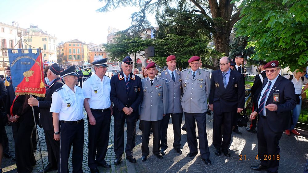 Nach wenig Schlaf ging es am Samstag sehr früh mit dem Shuttle-Bus nach Verona. Dort stand als nächster Programmpunkt das traditionelle Fahnenhissen und die Ehrung am Denkmal eines getöteten Carabiniere (Maresciallo Enrico Frassanito) an. Er wurde am 27. April 2006 zusammen mit anderen Carabinieri und Fallschirmjägern durch ein Attentat in Nassiriya (Irak) getötet. Dies natürlich alles sehr militärisch aufgezogen und akkurat durchgeführt. Sehr beeindruckend.