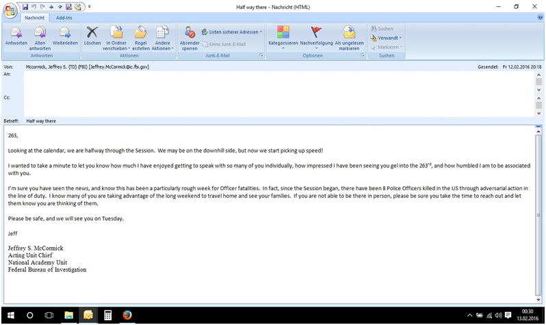 Viel Sitzfleisch bringt mich in Woche 5 in Bezug auf die zahlreichen schriftlichen Arbeiten, die ich vorzulegen habe, nochmals deutlich weiter und es ist Halbzeit. Die Anzahl der Tage, die ich noch an der FBI Academy verbringen werde, ist geringer als die Anzahl der Tage, die ich bereits hier bin – das Ziel rückt näher! Zu erwartende Highlights der kommenden Woche: Ein Vortrag von Director Andrew Traver, Naval Criminal Investigative Service (http://www.ncis.navy.mil/Pages/publicdefault.aspx) zur Thematik „Leadership and Lessons learned“ sowie der New York Field Trip am kommenden Wochenende.